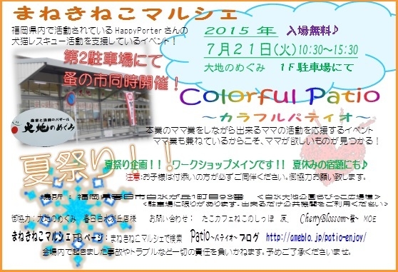 Patio〜パティオ〜主催の 「心音〜こころん〜」&「CherryBlossom〜桜〜」 本日のブログ更新はMOEです 今回、大地のめぐみ白水が丘店様より ご縁を頂き、会場のご協力を頂きまして Colorful Patio〜カラフルパティオ〜を開催致します。 *まねきねこマルシェ& ColorfulPatio〜カラフルパティオ〜* 2015年 7月 21日(火) 10:30〜15:30 場所:大地のめぐみ白水が丘店 駐車場スペース <小雨決行、雨天2Fスペースにて> 前回好評だった合同開催。 今回まねきねこマルシェさん