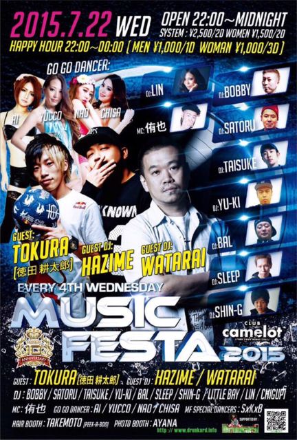 管理人様告知失礼します。 エントランスで、 「タイスケのゲストでキャメロット」 と言って頂ければ、 男性1500YEN/1D 女性1000YEN/2D のゲスト料金です。 また個別にでもゲストお取りできますので、メッセージください。 宜しくお願いします。 7/22(水)「MUSIC FESTA」 GUEST ACT: TOKURA GUEST DJ: HAZIME WATARAI DJ: BOBBY SATORU TAISUKE YU-KI SLEPT BAL SHIN-G LIN CHIGUPI 〜〜〜〜〜〜〜〜〜〜〜〜〜〜〜〜〜〜〜〜〜〜〜〜〜〜〜〜〜 〜〜〜〜〜〜〜〜〜〜