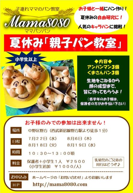 こんにちは。 東京都中野区野方から徒歩1分 子連れママのパン教室★mama8080ママパンパンより大好評の企画のお知らせです 夏休み「親子パン教室」を下記の日程で開催します ■日程: 7月22日(水) 8月6日(木) 8月18日(火) 8月19日(水) ■時間: 10:30〜13:00頃 ■内容: アンパンマンなどのキャラパンを作ります 生地のこねから焼成までをお子様で体験。 夏休みの自由研究にもどうぞ ■年齢: 小学生以上
