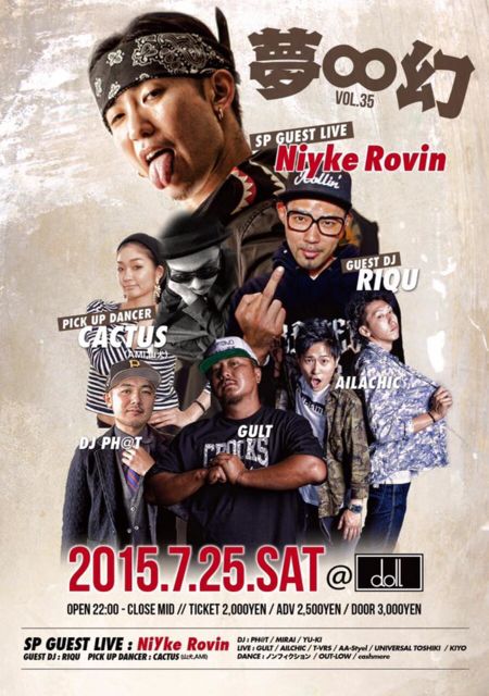 Ì´¡ç¸¸vol35 7/25¡Êsat¡Ë@doll OPEN 22:00 CLOSE: MID TICKET 2000yen ADV 2500yen DOOR 3000yen SP GUEST Niyke Rovin GUEST DJ RIQU GUEST DANCE CACTUS (AMI.»³¸¤) DJ PH@T MIRAI YU-KI LIVE GULT AILACHIC T-VRS AA-STYEL UNIVERSAL TOSHIKI KIYO DANCE ¥Î¥ó¥Õ¥£¥¯¥·¥ç¥ó OUT-LOW cashmere