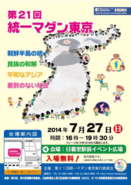 第21回統一マダン東京 主催:統一マダン東京実行委員会 後援:荒川区、荒川区国際交流協会、公益財団法人荒川区芸術文化振興財団(ACC) 日時:7月27日(日曜)午後4時30分から午後8時まで 入場無料(屋台多数20軒位、国際色豊富・食もお酒も) テコンドー、朝鮮舞踊、K-POPダンス、バンドライブなど飽きることない4時間、様々な演目があります 野外フェスなので、初めてでも仲良くなり一緒に飛び上がるなど、かなり盛り上がっているイベントです。 今年で21回21年続いている人気イベント、誰もが平和を望み、楽しくなれる