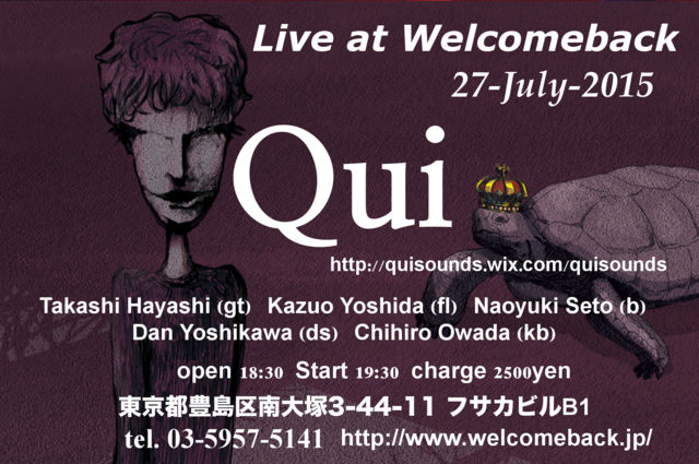 2015年7月27日 月曜日 Qui at 大塚welcomeback http://www.welcomeback.jp/ 林隆史 guitar 吉田一夫 flute 瀬戸尚幸 bass 吉川弾 drums 大和田千弘 keyboards open 18:30 start 19:30 charge 2500円 東京都豊島区南大塚3-44-11 フサカビルB1 03-5957-5141 Qui official website http://quisounds.wix.com/quisounds