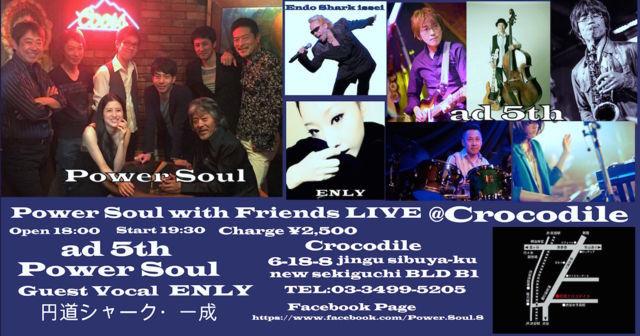こんにちは!Power Soulです 7月27日(月)に原宿クロコダイルでPower Soulのイベントライブを行います 今回は、Power Soulに所縁のあるヴォーカリストやミュージシャンをゲストに迎えて がつーーーんといっちゃいます 次の日がお仕事の方にも優しい、19時半スタートです。 是非観に来てくださいね 原宿Crocodile 〒150-0001 渋谷区神宮前6-18-8ニュー関口ビルB1 03−3499−5206 http://www.crocodile-live.jp/index2.html/ Open 18:00〜 Start 19:30〜 「ad 5th」 Guitar 関雅樹 Bass