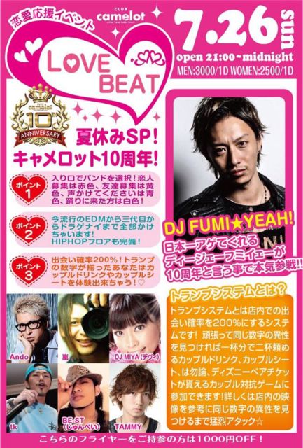 7/26(日)超話題の恋愛応援イベントLOVE BEAT!! CAMELOT10周年としての開催で普段以上に盛り上がる事間違いなしです! 今回はDJ FUMI★YEAH!が登場!! ☆ディスカウントゲスト受け付けてます☆ 通常3500円のところ ★★★★★★★★★★★★★★★★ CAMELOTエントランスにて 『ボーゲンのゲストでキャメ』★ ★★★★★★★★★★★★★★★★★★★★ と言えば特別ディスカウント ディスカウントの料金設定は、 男2000/1D 女1500/1D となっています …………………………………………………