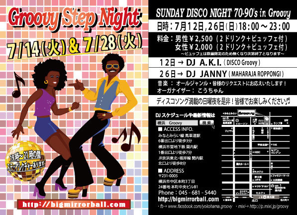 Âè2¡¦Âè4¤Î²ÐÍËÆü¤Ï¡ÚGroovy STEP NIGHT¡Û19»þ¡Á21»þ°Ì¤Î´Ö¡¢´Êñ¤Ê¥¹¥Æ¥Ã¥×¤È¥Õ¥ê¥Á¥ã¥Á¥ã¤Î¥ì¥¯¥Á¥ã¡¼¤¢¤ê¤Þ¤¹¡ª ½é¿´¼Ô¤ÎÊý¡¢¤ª°ì¿ÍÍͤǤ⡢ÅöŹ¥¹¥¿¥Ã¥Õ¤¬¤´Âбþ¤µ¤»¤ÆÄº¤¤Þ¤¹¤Î¤Ç¤É¤¦¤¾¤ªµ¤·Ú¤Ë¤´»²²Ã¤¯¤À¤µ¤¤¢ö ¡ÚDJ¡ÛHayasaka ¡Ú²»³Ú¡ÛALL MIX ¡Ê21»þ°Ì¤«¤é¤ÏÄ̾ï¤ÎDISCO TIME¤Ë¤Ê¤ê¤Þ¤¹¡£¥ê¥¯¥¨¥¹¥È¤Ë¤â½ÐÍè¤ë¸Â¤ê¤ª±þ¤¨¤¤¤¿¤·¤Þ¤¹¤Î¤ÇDJ¤Þ¤Ç¤É¤¦¤¾¢ö ¡Ú³«ºÅ»þ´Ö¡Û 19:00¡Á24:00 ¡ÚÎÁ¶â¡Û ÃËÀ¡§¡ï2,000/2Drinks¡Ü¥Ó¥å¥Ã¥Õ¥§ ½÷À¡§¡ï1,500/2Drinks¡Ü¥Ó¥å¥Ã¥Õ¥§ ¡Ê¥Ó¥å¥Ã¥Õ¥§¤Ï19»þ¤è¤ê¤´ÍѰÕÃפ·¤Þ¤¹¤¬¿ôÎ̸ÂÄê¤Î¤¿¤á̵