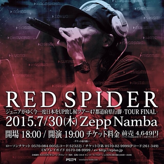 ※チケット一般発売開始!! (公演詳細) RED SPIDER47都道府県行脚-TOUR FINAL- 公演日 2015年7月30日(木) 開場 18:00/開演 19:00 会場 ZEPP Namba 入場料 4,649円(1Fスタンディング/2F指定) ※ドリンク代別途必要です。 ※未就学児童入場不可 ■チケット発売所 ローソンチケット 0570-084-005(Lコード:52322) http://l-tike.com/d1/AA02G01F1.do?DBNID=1&ALCD=1&LCD=52322 チケットぴあ 0570-02-9999(Pコード:261-349) http://ticket-search.pia.jp/pia/search_all.do?kw=261-349 CNプレイガイド 0570-08-9999 e+(イープラス