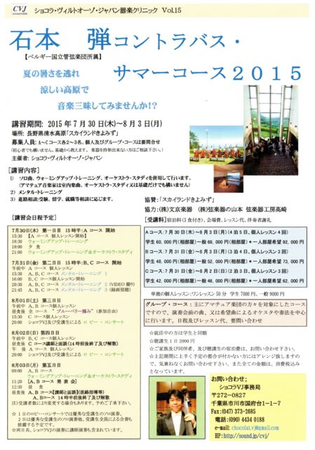 国内外にて多くの講習会受講及びオーケストラ経験による独自の入試・入団試験ソロ曲、 オケスタ演奏攻略法を涼しい高原でプロ・アマ問わず楽しく指導致します。 コントラバス奏者のお仲間がいる方は是非お声を掛けて下さい。 2003年夏から千葉県市川市で器楽クリニックとして個人及びグループレッスン他 、弦楽アンサンブルを行って参りましたが、2010年夏には白樺湖、そして2012年夏より松本近郊 清水高原の”スカイランドきよみず”(松本市を一望できる優雅な絶景)にて 「コントラバス・サマーコース 」として独立しました。 講師はベル