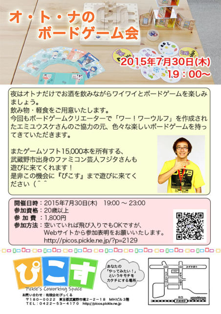 夜はオトナだけでお酒を飲みながらワイワイとボードゲームを楽しみましょう。 飲み物・軽食をご用意いたします。 今回もボードゲームクリエーターで「ワー!ワーウルフ」を作成されたエミユウスケさんのご協力の元、色々な楽しいボードゲームをたくさん持ってきていただけます。 初心者の方も大歓迎ですし、お一人の方も安心して参加出来ます。 また今回もゲームソフト15,000本以上を所有する、武蔵野市出身のファミコン芸人フジタさんも遊びに来てくれます! 開催日時:2015年7月30日(木) 19:00 〜 24:00 開催場所:ぴっくるのコワーキング
