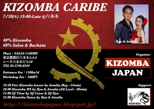 ★KIZOMBA CARIBE★ 現在、ヨーロッパや欧米で流行中のKizombaを習ってみませんか? 当日キゾンバのデモを楽しめます。パーティの選曲はKizomba中心で、Salsa、Bachata、などのオールラテンを楽しめます。会場は、六本木の人気バーサルサカリベです。 是非この機会に体験してみて下さい! ◆日時:7月30日(木)19:00-LATE ◆場所:六本木『SALSA CARIBE』 東京都港区六本木5-3-4 レーネ六本木ビル2F TEL: 03-3746-0244 http://www.salsacaribe.jp ◆料金 Entrance: 1500w1d Workshop: 1000yen ◆タイムテーブル