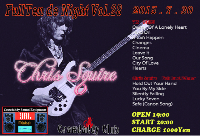 7/30 本日はフルテンde Night 第28夜 Chris Squire「90125&Fish Out Of Water」 リッケンをゴリゴリ聞きましょう!! OPEN 19:00 START 20:00 CHARGE 1000円 【フルテンde Night】とは、 手を替え品を変え テーマをもって心地のいい大音量で音楽を聞いてみようという企画 何十回も何百回もきいたものでも違う環境で じっくり 大音量で聞くと 今までとは違う発見をするんだと! 面白いです(^0^) 実際に大きくかかってるのは毎回1時間〜1時間半が目処 音が大きくてもクリアなので そこそこ話もできるのです だからがっつり聞