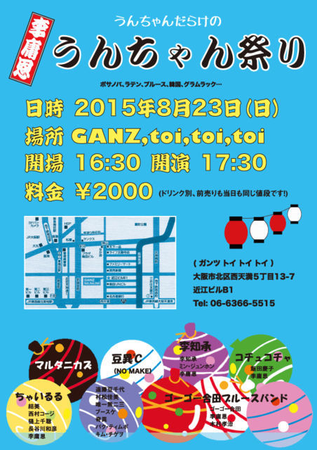 「うんちゃんだらけの うんちゃんまつり」 日時: 2015年8月23日(日) Open 16:30, Start 17;00 場所: GANZ,toi,toi,toi(ガンツトイトイトイ) 大阪市北区西天満5丁目13-7 近江ビルB1 Tel: 06-6366-5515 http://ganztoitoitoi.com/ チャージ: 2,000円(ドリンク別) FBページ: https://www.facebook.com/events/856709837752471/ [出演] - マルタニ カズ - ちゃいるる(結美、西村コージ、樋上千聡、長谷川和彦、李庸恩) - 豆異℃@NO MAKE (遠藤豆千代、村松佳美、唯一無二三、ブースケ、奇異、パク・