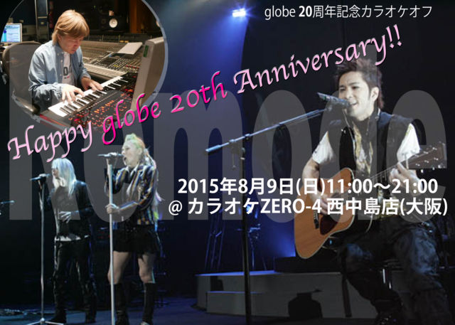 2015年8月9日、globeはデビュー20周年を迎えます。 そんな記念すべき日にgloberの皆さんと集まってお祝いをしたいと思います。 日時:8月9日(日) 11:00〜21:00 場所:カラオケZERO-4西中島店 http://b-kara.jp/zero4/ ランチ付きフリータイム 1,680円 ※人数などにより変更する場合があります。 定員:20名 機種:LIVE DAM STADIUM