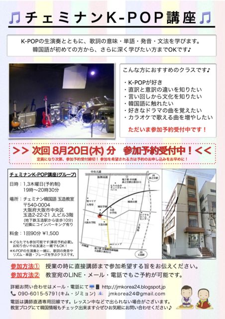♪チェミナンK-POP講座♪ K-POPの生演奏とともに、歌詞の意味・単語・発音・文法を学びます。 韓国語が初めての方から、さらに深く学びたい方までOKです♪ こんな方におすすめのクラスです♪ ・K-POPが好き ・直訳と意訳の違いを知りたい ・言い回しから文化を知りたい ・韓国語に触れたい ・好きなドラマの曲を覚えたい ・カラオケで歌える曲を増やしたい ただいま参加予約受付中です! >> 次回 8月20日(木) 分 参加予約受付中!<< 定員になり次第、参加予約受付締切! 参加を希望される方は予約のお申し込みをお