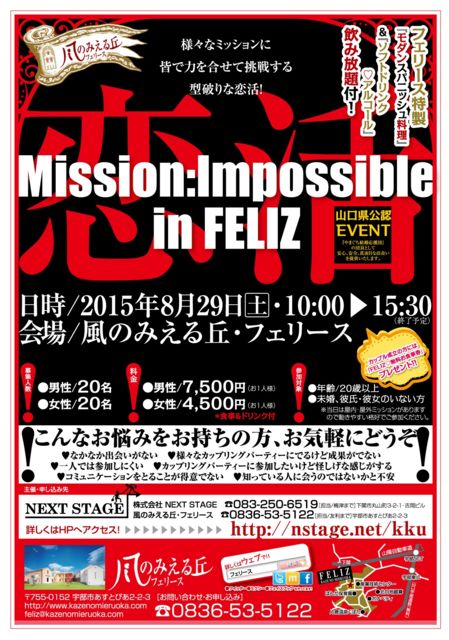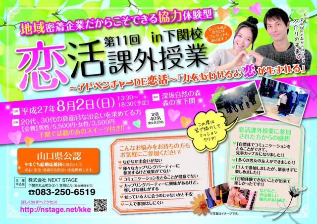 Ê¡²¬¸©¤ÎËÌÉô¤Ë¤ª½»¤Þ¤¤¤Î20Âå¡¢30Âå¤ÎÊý¡¹¤Ø ³¤¶®¤òÅϤäÆÎø¤·¤Þ¤»¤ó¤«¡ª¡© ÃϰèÌ©Ãå´ë¶È¤À¤«¤é¤³¤½¤Ç¤¤ë ¶¨ÎÏÂθ³·¿¥«¥Ã¥×¥ê¥ó¥°¥Ñ¡¼¥Æ¥£¡¼ »³¸ý¸©¸øÇ§¤ÎÎø³è¥¤¥Ù¥ó¥È²ñ¼Ò¤¬¼çºÅ¤·¤Þ¤¹¡ª ¡ÚÎø³è²Ý³°¼ø¶ÈIN²¼´Ø¹»¡Û ¤³¤ÎÅ٤ϳ§¤Ç¶¨ÎϤ·¤Æ¡Ø¥¢¥É¥Ù¥ó¥Á¥ã¡¼DEÎø³è¡Ù Á°²óÅÙ¥¥ã¥ó¥»¥ëÂÔ¤Á³½Ð¡ª¡ªÂ繥ɾ¤Ë¤Ä¤Ç¯ÂåÁؤò¤«¤¨¤Æ³«ºÅ·èÄꡪ¡ª ¤ª¤ä¤Ä¥¿¥¤¥à¤Ç¤Ïº£²¼´Ø¤ÇÏÃÂê¤Î¥¹¥¤¡¼¥Ä¤òÄ󶡤·¤Þ¤¹¡£ ¤ªÊ¢¤â¿´¤â°ìÇդˤʤ뤳¤È´Ö°ã¤¤¤Ê¤·¤Ç¤¹¡£ ¡ú¡ú²áµî¤Î¥¤¥Ù¥ó¥ÈÉ÷·Ê¤ä¾ÜºÙ¤ÏHP¤ò¤´Í÷¤¯¤À¤µ¤¤¡ú¡ú http://nstage.net/kke ¤³¤ó¤Ê¤ªÇº¤ß