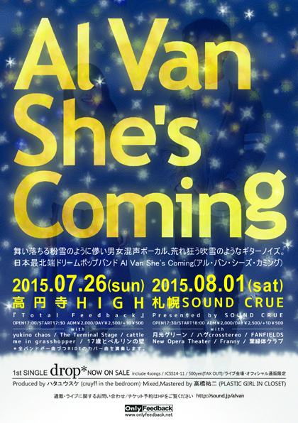 2015.08.01(ÅÚ) ¡Ø¥¿¥¤¥È¥ë̤Äê¡Ù ¡÷»¥ËÚSOUND CRUE(Ë̳¤Æ»»¥ËÚ»ÔÃæ±û¶èÂçÄÌÅì2ÃúÌÜ15-1-2) OPEN17:30/START18:00 ADM¡ï2,000/DAY¡ï2,500/1DRINKÂåÊÌÅÓ¡ï500 ¡ÚLIVE ACT¡Û ·î¸÷¥°¥ê¡¼¥ó ¥Ï¥°crosstereo FANFIELDS New Opera Theater Franny ÍÕÎÐÂÎ¥¯¥é¥Ö Al Van She's Coming ¥Á¥±¥Ã¥ÈͽÌ󡦤ªÌä¹ç¤» http://sound.jp/alvan