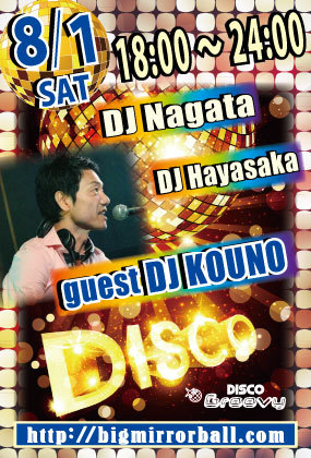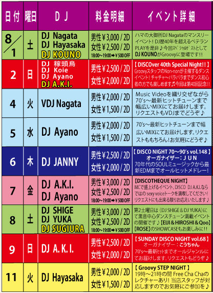 DISCO Groovy 毎月第1土曜日は!ハマの重鎮《DJ Nagata》による定期イベント♪ 今回スペシャルゲストとして《DJ KOUNO》が登場です。長年のキャリアに裏付けされた安定感抜群なPLAYをどうぞご堪能ください! 【音楽】オールジャンル Dance Classics、Soul、Funk、R&B、Hip-Hop、EDM、etc... 【開催時間】 18:00〜24:00 【ハッピーアワー料金 / 18:00〜19:00にご来店の方】 男性:¥2,500/2Drinks+ビュッフェ付 女性:¥2,000/2Drinks+ビュッフェ付 【料金 / 19:00以降ご来店の方】 男性:¥3,000/2Drinks+ビュッフェ付 女性
