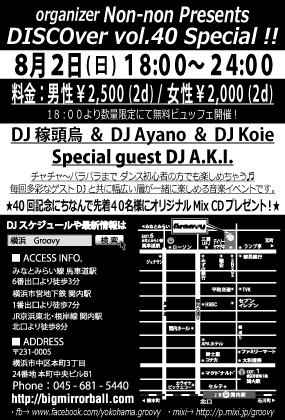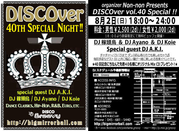 ¡Ú8·î¤âÂ裱ÆüÍËÆü¤Ë³«ºÅ¡ª¡Û DISCO Groovy¥¹¥¿¥Ã¥Õ¤ÎNon-non¤¬¼çºÅ¤¹¤ë¥À¥ó¥¹¥¤¥Ù¥ó¥È¡Ú¥Ç¥£¥¹¥«¥Ð¡¼¡Û¥Á¥ã¥Á¥ã¡Á¥Ñ¥é¥Ñ¥é¤Þ¤Ç ¥À¥ó¥¹½é¿´¼Ô¤ÎÊý¤Ç¤â³Ú¤·¤á¤Á¤ã¤¤¤Þ¤¹¢ö º£²ó¤Ï¡ª40²óÌܤγ«ºÅµÇ°¤È¤¤¤¦¤³¤È¤ÇÆÃŵ¤¬À¹¤êÂô»³¡ª https://www.facebook.com/discover.1stsunday ¡ÚDJ's¡Û ¥²¥¹¥ÈDJ A.K.I. / DJ ²ÔƬ±¨ / DJ Koie / DJ Ayano ¡Ú²»³Ú¡Û¥ª¡¼¥ë¥¸¥ã¥ó¥ë Dance Classics¡¢Soul¡¢Funk¡¢R&B¡¢Hip-Hop¡¢EDM¡¢Eurobeat¡¢etc... ¡Ú³«ºÅ»þ´Ö¡Û 18:00¡Á24:00 ¡ÚÎÁ¶â¡Û ÃËÀ¡§¡ï2,500/2Drinks¡Ü¥Ó¥å¥Ã¥Õ¥§ ½÷À¡§¡ï2,000/2Drinks