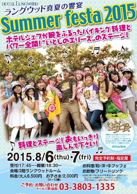 今年もやります日暮里ラングウッドの夏祭り♪ エリーズライブをお仲間やご家族と円卓で着席しておいしいお食事やお飲物を好きなだけ食べてゆっくりくつろいで見れるのは年間を通してこのイベントだけです。 昨年も一昨年もお陰さまで両日満員御礼でした。 今年も時間たっぷりワンマンショーです。 完全予約制・指定席、定員になり次第締め切ります。混雑の場合、相席の可能性もございます。 なんと早くも8/7は400席SOLD OUT! 8/6はまだ残ってます。 ご予約の際、「エリーズのHPを見ました」で500円オフ。そして比較的ステージが見やすいテーブ
