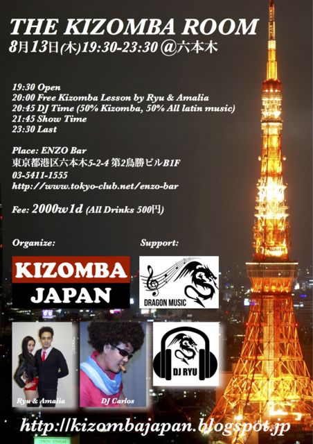 ★THE KIZOMBA ROOM @六本木★ Kizombaはアンゴラ発祥で、ヨーロッパを始め世界的に流行りつつある最先端のダンス。ロマンチックでセクシーな世界に酔いしれましょう! Kizombaにはまっている方はもちろん、初めての方も無料レッスンがあるので楽しめます。 新しい会場は、ENZO Bar。オシャレでカッコイイお店です。 是非この機会に、話題のKizombaを踊りましょう♪ 【お得な特典】 ★無料Kizombaレッスン ★CDプレゼント(先着10名) ◆日時:8月13日(木)19:30-23:30 ◆場所:ENZO Bar 東京都港区六本木5-2-4 第2鳥勝ビル