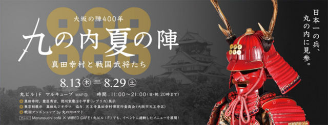 大坂夏の陣で活躍し日本一の兵と謳われた真田幸村をはじめ、豊臣秀吉や徳川家康など名将たちの甲冑レプリカや東京では初となる「真田丸」復元ジオラマを展示。さらに、丸ビル4F「丸の内ロフト」による戦国グッズショップとして「戦国魂」も登場します。 また期間中、丸ビル1F「Marunouchi Cafe × WIRED CAFE」では、真田幸村をイメージしたオリジナルメニューを提供。 この夏は丸の内で、戦国時代の世界観をお楽しみください。 開催期間 8月13日(木)〜29日(土)11:00〜21:00 (日曜は11:00〜20:00) 会場 丸ビル1F マルキューブ 主