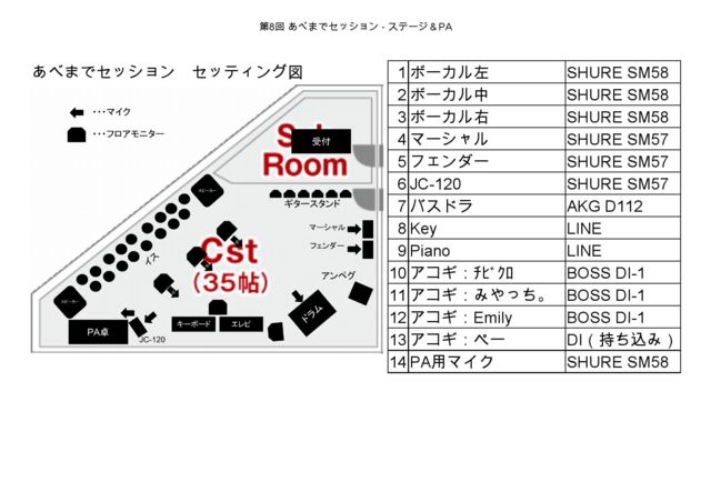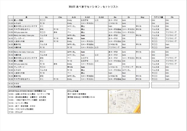 忙しいEmilyさんの代わりに今回主催やることになりました。よろです( ̄▽ ̄ ) ★★★★★★★★★★★現在のステータス★★★★★★★★★★★★ 当日に向けてセットリストに目を通しておいてください( ̄▽ ̄ ) セッションルール http://mixi.jp/view_bbs.pl?comm_id=4828865&id=55481273&comment_count=6 曲と担当者割り当てリスト&セットリスト&セッティング図 https://docs.google.com/spreadsheets/d/1BjFBCpWBHiU7bPAMeoHyEgxv5l182-fYwKLxvDLxeWQ/pubhtml ★★★★★★★★★★★★★★★★★★★★★★★★★★★★★★