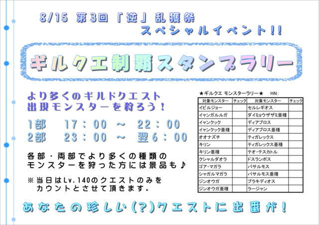 どうもSoifonです☆ 超久しぶりにやってまいりました『乱獲祭』と対となるこのイベント! ☆★☆『第3回逆乱獲祭』☆★☆ 今回は新企画もご用意してます! 名づけて『ギルクエ制覇スタンプラリー!』 より多くのギルクエモンスターと戦おうというのがテーマのこの企画! ギルクエにはラージャンやジンオウガ以外にも数々のモンスターがいますよね^^ たまにはバサルやクック、キリンも思い出してあげましょう☆ いろんなモンスターを狩って乙っていきましょう^^ それぞれの部、両部でより多くの種類のモンスター(lv140)を狩った