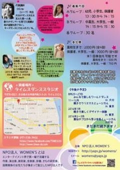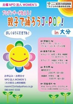 women's 初の東京以外 イベントが遂に始まります 親子で踊ろうJ-POP in大分 大分県は日本の中でも ダンスが盛んなダンス県 東京では6月に 坂本まさる先生が とっても楽しい ダンスワークショップを して下さいました 6月のJ-POPの様子は ホームページで 写真付きで ご覧頂けます http://yaps.jp/womens/ そして いよいよ始まる大分♪ 詳しい情報の載った チラシも出来ました そのチラシがこちら 是非是非見て下さ