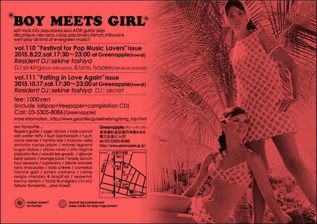 高円寺にて定期的に行われているDJパーティー / イベント「BOY MEETS GIRL」。 選曲ジャンルはSOFT ROCK, CITY POP, AOR, GUITAR POP, BOSSA, SOUL, DISCOTIQUE, NEO- ACO, LOVERS, FRENCH, JAZZ, LOUNGE, フリッパーズ・ギターや小沢健二、コーネリアス、ピチカート・ファイヴ、Lamp、キリンジを初めとするJ-POPなど…。メロディアスなポップスがお好きな方はぜひ足をお運び下さい。 アンケートに答えて戴いた方にはセレクションCDーRのプレゼントもございます! ———————— 8月の「ボーイ・ミ