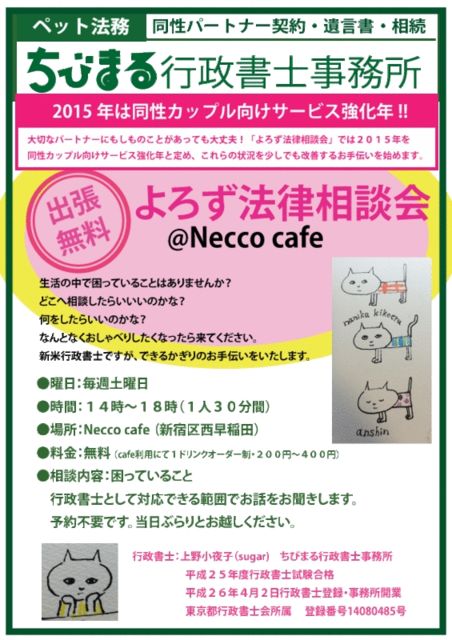 昨年は開業一年目にして様々なご相談、ありがとうございました! ちびまる行政書士事務所は開業2年目を迎えた本年2015年を 「同性カップル向けサービス強化年」と定め、お手伝いをすることにいたします。 大切なパートナーにもしも、のことがあっても 今の日本の法制度の中で同性のパートナーは口出しができません。 この状況を少しでも改善するお手伝いをいたします。 生活の中で困っていることはありませんか? どこへ相談したらいいのかな? 何をしたらいいのかな? なんとなくおしゃべりしたくなったら来てください。 新米行政書