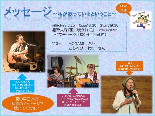 ǽưŪ¤Ë¥é¥¤¥Ö¤ò¤·¤è¤¦¡ª ¤µ¤Ã¤½¤¯´ë²è¥é¥¤¥Ö¤Ç¤¹¡£¤È¤¤¤Ã¤Æ¤â8·î¤Ç¤¹¤¬¡£ ¥Æ¡¼¥Þ¤Ï¡¢¡Ö¥á¥Ã¥»¡¼¥¸¡Á»ä¤¬²Î¤Ã¤Æ¤¤¤ë¤È¤¤¤¦¤³¤È¡Á¡×¤Ç¤¹¡£ Ekko¤Ï°ì¿Í¤Ç¥Ô¥¢¥ÎÃÆ¤¸ì¤ê¥¹¥¿¥¤¥ë¤Ç½Ð¤Þ¤¹¡£ ¥²¥¹¥È¤Ï¡¢¥¨¥ê¥Ã¥¯¤µ¤ó¤ÈKanna¤µ¤ó¤Î¥æ¥Ë¥Ã¥È¡¢¤³¤â¤ì¤Ó¤Õ¤ï¤ê¤È£Í£Ï£Ç£Á£Í£É¤µ¤ó¤Ç¤¹¡£ 3ÁȤ¬¤½¤¨¤¾¤ì£Í£Ã¤¿¤Ã¤×¤ê¤Î40ʬ¥¹¥Æ¡¼¥¸¤ò£¤ê¤Þ¤¹¡£ ¤É¤¦¤¾¤ª¤¤¤Ç¤¯¤À¤µ¤¤¡£