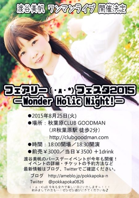 ÅÏëÈþÈÁpresents ¥Õ¥§¥¢¥ê¡¼(¡¦§Õ¡¦*)¥Õ¥§¥¹¥¿2015 ¡ÝWonder Holic Night!¡Ý ¡ÚÆü¤Ë¤Á¡Û2015ǯ8·î25Æü¡Ê²Ð¡Ë¡¡ ¡Ú»þ´Ö¡Û 18:00³«¾ì¡¿18:30³«±é ¡Ú¥Á¥±¥Ã¥ÈÂå¡Û Á°Çä¡ï3000¡¿ÅöÆü¡ï3500¡¡¡Ü1drink ¡Ú¾ì½ê¡Û ½©ÍÕ¸¶CLUB GOODMAN ¡¡http://clubgoodman.com/access.html ¡Ú¥Á¥±¥Ã¥ÈͽÌ󡦤ªÌ䤤¹ç¤ï¤»¥á¡¼¥ë¥¢¥É¥ì¥¹¡Û ¡¡watayamiho.info@gmail.com Áá´üͽÌóÆÃŵ¤òÀ½ºî¡ª 7·î31Æü(¶â)23:59¤Þ¤Ç¤ËͽÌ󤯤À¤µ¤Ã¤¿Êý¤Ë ²ñ¾ì¤Ë¤ÆÆÃŵ¤ò¥×¥ì¥¼¥ó¥È¤¤¤¿¤·¤Þ¤¹¢ö ¤Þ¤¿¡¢¥ê¡¼¥Ç¥£¥ó¥°¥é¥¤¥Ö¤Ç¤Î¥Á¥é¥·¤ò¤ª»ý¤Á¤ÎÊý¤Ï¤´Í½Ìó¤ÎºÝ¤ËÈ÷¹ÍÍó¤Ø