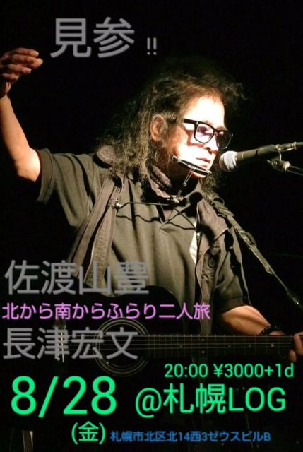詳細等わかり次第アップします。 8月19日(水) 札幌「琉球酒場りっかりっか」 開演:20:00〜 料金:2000円 8月20日(木) 室蘭「コミュニティCAFE&LiveBar 黒猫屋」 開場時間:19:00 開演時間:19:30 料金 2000円(1d付き) 室蘭市高砂町1−44−13 090‐1644‐7980 8月21日(金) 函館 8月22日(土) 小樽 「一匹長屋」 開場:17:30 開演:⒙:00 料金:予約/3000円 当日/3500円 8月23日(日) 札幌市厚別 サンピアザ劇場 開場13:00/開演13:30 終演20:00 前売り3000円※チケット