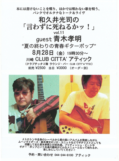 8月28日(金) 神奈川県 川崎 CLUB CITTA’ アティック http://clubcitta.co.jp/attic/ 「和久井光司の「言わずに死ねるかッ!」 vol.11 〜夏の終わりの青春ギターポップ〜」 出演: [ホストMC] 和久井光司 [ゲスト] 青木孝明 open19:00 start19:30 前売り2500円 当日2800円 共に+1DRINK メトロトロンや自身のレーベルから質の高いアルバムを発表しながら、ムーンライダーズ・鈴木博文のソロ・ユニットなどでギタリストとしても活躍してきた青木孝明との初共演!ブリティッシュ・ビートやギター・ポップと言う共通の趣味がどん