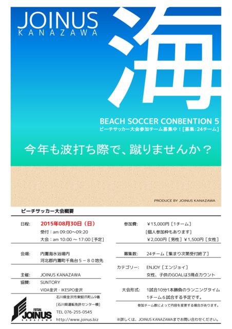 今年もこの季節がやって来ました 今年で5回目の開催となる、 ジョイナス金沢主催の夏の祭典 [2015 BEACH SOCCER] 年齢、性別、経験一切関係なし 夏のイベントとして、みんなで楽しく、 波打ち際でボール蹴りましょう 今年は募集参加チーム数も大幅に増やし、 大規模なイベントになる予定なので、 盛り上がること間違いなし 2015年の夏の思い出に ゼヒゼヒ参加してみてはいかがでしょうか 2015 BEACH SOCCER 日程 :8月30日(