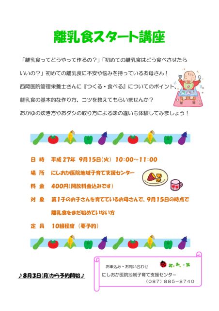 9月15日(火)10:00〜11:00 離乳食スタート講座 初めての離乳食に不安や悩みはつきもの。『体をつくる・素材を生かして食べる』の大切さや離乳食の基本的な作り方を管理栄養士さんに教わりましょう。 第1子のお子さんを育てているお母さんで、今から離乳食を始めようと思っている方が対象です。 くわしくはチラシを見てね。