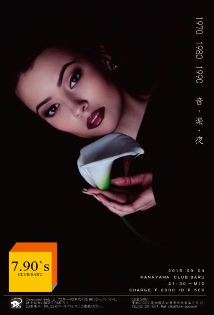 管理人様 告知失礼いたします。 9月4日(金) さて、夏を満喫することなく 盆も過ぎようとしております。、 ということで、 初秋に新イベント開催です。 「セブンポイントナインティーズ」 7.90's 70年代〜90年代の 音楽に浸る紳士淑女のDJ PARTYです。 ☆GUEST DJ☆ DJ UZ VDJ Y's 他 OPEN 21:30〜Mid CHARGE \2000 D\500 ☆フード持ち込み自由☆ 是非とも皆様お越しください! CLUB SARU http://clubsaru.wix.com/clubsaru-hp 愛知県名古屋市中区金山3-5-23 TEL 052-