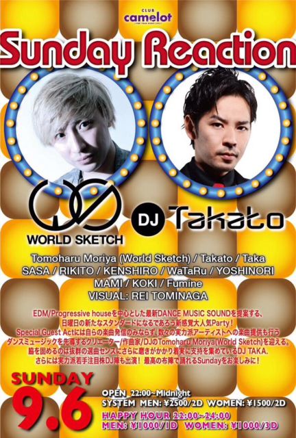 9·î6Æü(Æü) ¡ÖSUNDAY REACTION¡× @½Âë CAMELOT 4·î¤«¤é³«ºÅ¤µ¤ì¤¿TJO¤ÈTAKATO¤Ë¤è¤ê³«ºÅ¤µ¤ì¤ëºÇ¿·¤ÎDANCE MUSIC¤ò¤ªÆÏ¤±¤¹¤ëNEW PARTY¡ÖSUNDAY REACTION¡×¡ª º£²ó¤ÏTomoharu Moriya(WORLD SKETCH)¤¬½Ð±é¡ª Âç¿Íµ¤ÆüÍËÆü¤ÎCAMELOT¤¬²ÆµÙ¤ß¤Ç¹¹¤ËÀª¤¤¤òÁý¤·¤Þ¤¹¡ª500¿Í¥ª¡¼¥Ð¡¼´Ö°ã¤¤¤Ê¤·¤Ç¤¹¡ª ¥Ç¥£¥¹¥«¥¦¥ó¥È¼õÉդƤ¤¤Þ¤¹¡ª ¡ú¡ú¡ú¡ú¡ú¡ú¡ú¡ú¡ú¡ú¡ú¡ú¡ú¡ú¡ú¡ú¡ú¡ú¡ú¡ú¡ú¡ú¡ú¡ú¡ú ¥¥ã¥á¥í¥Ã¥È¥¨¥ó¥È¥é¥ó¥¹¤Ë¤Æ ¡Ö¥Ü¡¼¥²¥ó¤Î¥²¥¹¥È¤Ç¥¥ã¥á¡× ¤È¸À¤Ã¤Æ¤¤¤¿¤À¤±¤¿¤é¡¢ ¡ú¥²¥¹¥ÈÎÁ¶â¡ú 12»þ¤Þ¤Ç ÃËÀ¡§1000±ß