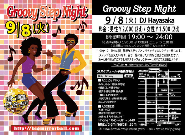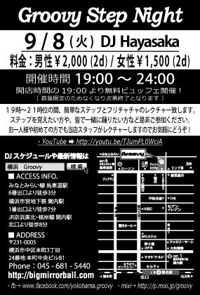 Âè2¡¦Âè4¤Î²ÐÍËÆü¤Ï¡ÚGroovy STEP NIGHT¡Û19»þ¡Á21»þ°Ì¤Î´Ö¡¢´Êñ¤Ê¥¹¥Æ¥Ã¥×¤È¥Õ¥ê¥Á¥ã¥Á¥ã¤Î¥ì¥¯¥Á¥ã¡¼¤¢¤ê¤Þ¤¹¡ª ½é¿´¼Ô¤ÎÊý¡¢¤ª°ì¿ÍÍͤǤ⡢ÅöŹ¥¹¥¿¥Ã¥Õ¤¬¤´Âбþ¤µ¤»¤ÆÄº¤¤Þ¤¹¤Î¤Ç¤É¤¦¤¾¤ªµ¤·Ú¤Ë¤´»²²Ã¤¯¤À¤µ¤¤¢ö ¡ÚDJ¡ÛHayasaka ¡Ú²»³Ú¡ÛALL MIX ¡Ê21»þ°Ì¤«¤é¤ÏÄ̾ï¤ÎDISCO TIME¤Ë¤Ê¤ê¤Þ¤¹¡£¥ê¥¯¥¨¥¹¥È¤Ë¤â½ÐÍè¤ë¸Â¤ê¤ª±þ¤¨¤¤¤¿¤·¤Þ¤¹¤Î¤ÇDJ¤Þ¤Ç¤É¤¦¤¾¢ö ¡Ú³«ºÅ»þ´Ö¡Û 19:00¡Á24:00 ¡ÚÎÁ¶â¡Û ÃËÀ¡§¡ï2,000/2Drinks¡Ü¥Ó¥å¥Ã¥Õ¥§ ½÷À¡§¡ï1,500/2Drinks¡Ü¥Ó¥å¥Ã¥Õ¥§ ¡Ê¥Ó¥å¥Ã¥Õ¥§¤Ï19»þ¤è¤ê¤´ÍѰÕÃפ·¤Þ¤¹¤¬¿ôÎ̸ÂÄê¤Î¤¿¤á̵