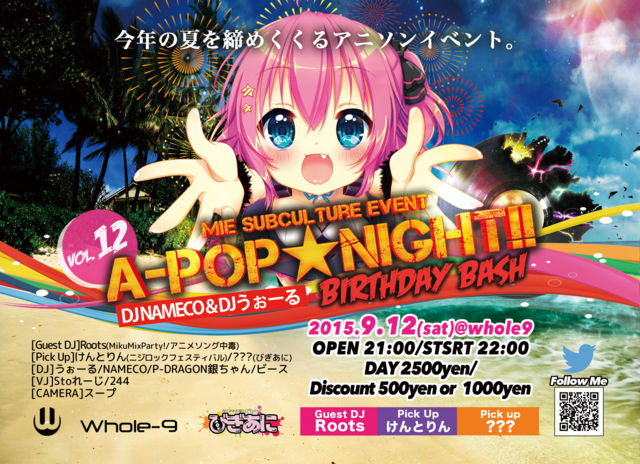 A-POP¡úNight!! vol.112 ÆüÄø : 2015.9.12(sat) »þ´Ö : OPEN 21:00~ START 22:00~ ÎÁ¶â : ÅöÆü 2500yen ¾ì½ê : whole9¡Ê»°½Å¸©Î뼯»ÔÈÓÌî»û²ÈÄ®105-1) ¤³¤Á¤é¤Ç»²²ÃɽÌÀ¤·¤Æ¤¤¤¿¤À¤¯¤È 500yen OFF¡ª¡ª¡ª ¤µ¤é¤Ë¡ª¡ª¥³¥¹¥×¥ì»²²Ã¤·¤ÆÄº¤¯¤È+500yen OFF!! »²²ÃɽÌÀ+¥³¥¹¥×¥ì»²²Ã¤Ç1000yen OFF¤È¤ªÆÀ¡ª¡ª http://tweetvite.com/event/apop12