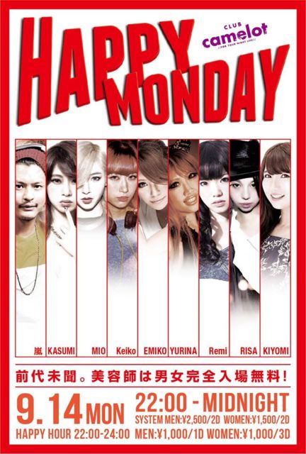 9-14 (·î) HAPPY MONDAY@camelot Í褿¿ÍÁ´°÷¤¬Happy¤Ë¤Ê¤ì¤ëHappy Monday¡ª ¡Æþ¾ìÎÁÂçÉý°Â¡ª ¢500±ß¥É¥ê¥ó¥¯¥á¥Ë¥å¡¼Åо졪¥ê¡¼¥º¥Ê¥Ö¥ë¤ÊÎÁ¶â¤Ç¥É¥ê¥ó¥¯Get!! £ÈþÍÆ»Õ¤ÎÃ˽÷¤Ï´°Á´Æþ¾ì̵ÎÁ¡ª¡ª ¤¥¥ã¥á¥í¥Ã¥È¥ì¥¸¥Ç¥ó¥ÈDJ¤â»²À°ÂÄê´¶¤Î¤¢¤ë½µËö¤Î¥¥ã¥á¥í¥Ã¥È¥µ¥¦¥ó¥É¤¬·îÍˤÎÌ뤫¤éÀ¹¤ê¾å¤²¤Æ¤¤¤¤Þ¤¹¡ª ¥Ëè½µ·îÍˤ¬³«ºÅ¡ªÉÔÄê´ü¤Î·îÍ˵٤ߤ¬¤Ê¤¯¤Ê¤ê¤Þ¤¹¡£·îÍË¥¥ã¥á¥í¥Ã¥È¤Ë¤¯¤ì¤Ð´Ö°ã¤¤Ìµ¤·¡ª ¥¨¥ó¥È¥é¥ó¥¹¤Ç ¸Þ½½Íò¥²¥¹¥È¤Î¥¥ã¥á¥í¥Ã¥È¤È¸À¤¨¤Ð ÃËÀ1500±ß/1D¡Ü1S¡¢½÷À1000±ß2D¡Ü1S¤Ç¤¹¡ª SYSTEM MEN¡ï2500/2d WOMAN1