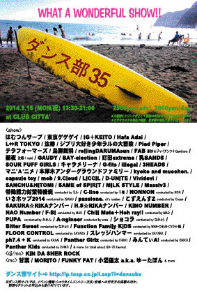 ¥Ç¥¤¥¿¥¤¥à¡¦¥À¥ó¥¹¥¤¥Ù¥ó¥È¤Î·èÄêÈǡ֥À¥ó¥¹Éô¡×¡¢ £¹·î¤Ë³«ºÅ¤µ¤ì¤ëÂ裳£µÃÆ¡ª ¢¨Ëè²ó60-70¥Á¡¼¥à¤Û¤É¤Î½Ð±é¥Á¡¼¥à¤¬¤¢¤ê¤Þ¤¹¡£ ¤µ¤Þ¤¶¤Þ¤Ê¥¸¥ã¥ó¥ë¡¢¥¹¥¿¥¤¥ë¤Î¥Á¡¼¥à¡¦¥æ¥Ë¥Ã¥È¡¦¥Ê¥ó¥Ð¡¼¤Î½¸¤Þ¤Ã¤¿¥¤¥Ù¥ó¥È¤Ç¤¹¡£ ³Æ¥Ê¥ó¥Ð¡¼¤Î¿¶Éդ⸫¤É¤³¤í¤Î¤Ò¤È¤Ä¡£¹ë²Ú¤Ê¥²¥¹¥È¥Á¡¼¥à¤â½Ð±é¡£ ´ØÅì¤Ç¤âºÇÂ絬ÌϤβñ¾ì¤Î¥¹¥Æ¡¼¥¸¤Ç¡¢¤¼¤Ò¤È¤Ã¤Æ¤ª¤¤Î¥·¥ç¡¼¤òÈäϪ¤·¤Æ¤¯¤À¤µ¤¤¡ù ¥À¥ó¥¹Éô35 -WAT A WONDERFUL SHOW!!!!- 2014.9.15 (MON/½Ë) 13:30-21:00 at CLUB CITTA' 2500yen(adv), 3000yen(day) *Æþ¾ì»þ¥½¥Õ¥È¥É¥ê¥ó¥¯