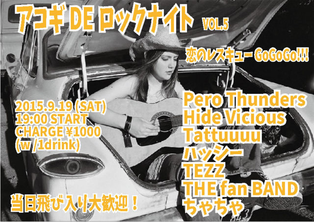 ¥¢¥³¥®DE¥í¥Ã¥¯¥Ê¥¤¥È¡¡Vol.5 Îø¤Î¥ì¥¹¥¥å¡¼GoGoGo!!! 2015.9.19 (SAT) 19:00 START CHARGE \1000 (w/ 1drink) ¡ù¡¡Pero Thunders ¡ù¡¡Hide Vicious ¡ù¡¡Tattuuuu ¡ù¡¡¥Ï¥Ã¥·¡¼ ¡ù¡¡TEZZ ¡ù¡¡THE fan BAND ¡ù¡¡¤Á¤ã¤Á¤ã ÅöÆüÈô¤ÓÆþ¤êÂç´¿·Þ¡ª¡ª