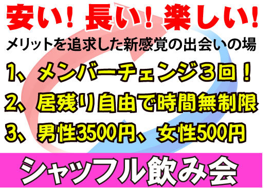 ¡Ú9/19ÅÚ¥·¥ã¥Ã¥Õ¥ë°û¤ß²ñ¤ÎÆÃħ¡Û 1¡¢ÃËÀ3500±ß¡¢½÷À500±ß¤ÈĶ¥ê¡¼¥º¥Ê¥Ö¥ë¤À¤«¤é¤ª»î¤·´¶³Ð¤Ç»²²Ã¤Ç¤¤ë¡ª 2¡¢¥á¥ó¥Ð¡¼¥Á¥§¥ó¥¸¤¬3²ó¤â¤¢¤ë¤«¤é¡¢°û¤ß²ñ3²óʬ¤Î¥É¥¥É¥¤È¥ï¥¯¥ï¥¯¡ª 3¡¢»þ´Ö̵À©¸Â¤À¤«¤é3»þ´Ö¤Ç¤â¡¢4»þ´Ö¤Ç¤â»þ´Ö¤òµ¤¤Ë¤»¤º¿¼Ìë¤Þ¤Ç³Ú¤·¤á¤ë¡ª ¤ªÇۤꤹ¤ë¥·¥ã¥Ã¥Õ¥ë¥«¡¼¥É¤Ë¤è¤Ã¤Æ¡¢Ïä¹Áê¼ê¤¬¥Á¥§¥ó¥¸¤¹¤ë¿·´¶³Ð¤Î¥³¥ß¥å¥Ë¥±¡¼¥·¥ç¥ó¥Ñ¡¼¥Æ¥£¡¼¤Ç¤¹¡ú ¢£Æü»þ 9/19(ÅÚ)19:15¡Á21:30 ¢¨¿¼Ìë¤Þ¤Çµï»Ä¤ê¼«Í³ ¢£¼õÉÕ 19:00¡Á ¢£½¸¹ç¾ì½ê Stand Bar 300 (¿·±É) ¢£½»½ê °¦Ãθ©Ì¾¸Å²°»ÔÃæ¶è¿·±É2ÃúÌÜ1-4