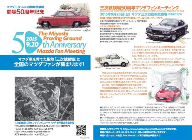 実はあるルートより半年くらい前から動員の要請が来ていたのですが,掲題のイベントについてマツダ株式会社さまよりご案内がありました。 来秋の旧車ピクニックも兼ねての開催になると思います。 詳細については別途ご案内しますが,これだけのイベントですので,早めに募集をし,参加を締め切る可能性もありますので,是非とも日にちを確保しておいてくださいね! ※マツダ株式会社さまは協賛と言う形になります。 −−−−−−−−−−−−−−−−−−−−−−−−−−−− いつもお世話になっております。 イベントのお知らせをさ