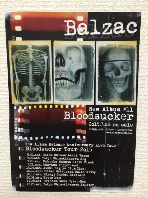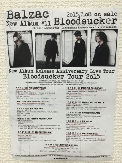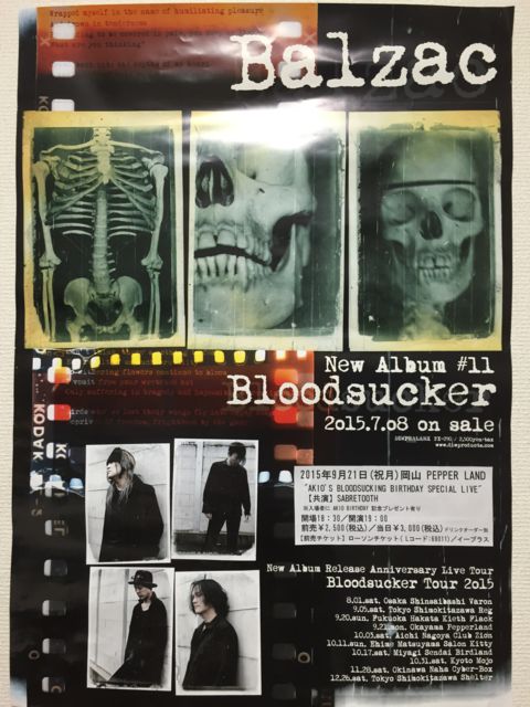 2015年9月21日(祝•月) at.岡山PEPPER LAND BALZAC NEW ALBUM発売記念TOUR 【"BLOODSUCKER TOUR 2015"】 AKIO'S BLOODSUCKING BIRTHDAY SPECIAL LIVE (BAND) ・BALZAC (共演) ・SABRETOOTH (ADV)¥2,500(税込) (DOOR)¥3,000(税込) (Open)18:30 (Start)19:00 ※入場者にAKIO BIRTHDAY記念プレゼントがございます。 【BALZACファンクラブ先行発売】 5月13日(水)発売開始 BALZAC FIENDISH CLUB 電話 06-5631-5601 http://www.balzac.jp/fiendishclub 通販はこちらから→悪魔商会 http://fiendishclub.ocnk.net ※会