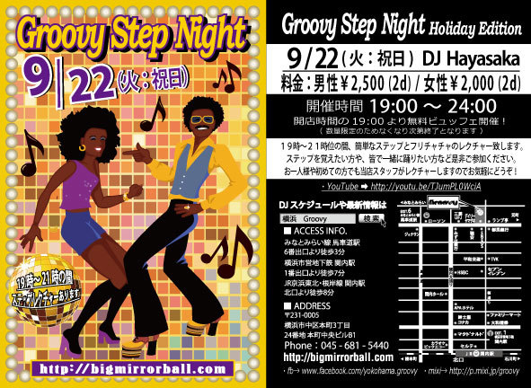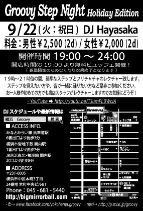 DISCO Groovy £¹·îÏ¢µÙ¤Î²ÐÍËÌë¡ÚGroovy STEP NIGHT¡Û19»þ¡Á21»þ°Ì¤Î´Ö¡¢´Êñ¤Ê¥¹¥Æ¥Ã¥×¤È¥Õ¥ê¥Á¥ã¥Á¥ã¤Î¥ì¥¯¥Á¥ã¡¼¤¢¤ê¤Þ¤¹¡ª½é¿´¼Ô¤ÎÊý¡¢¤ª°ì¿ÍÍͤǤ⡢ÅöŹ¥¹¥¿¥Ã¥Õ¤¬¤´Âбþ¤µ¤»¤ÆÄº¤¤Þ¤¹¤Î¤Ç¤É¤¦¤¾¤ªµ¤·Ú¤Ë¤´»²²Ã¤¯¤À¤µ¤¤¢ö Ê¿Æü¤À¤È¤´ÍèŹ¤¬Æñ¤·¤¤Êý¤âº£²ó¤Ï½ËÆü¡õ½ËÁ°Æü¤Ç¤¹¤Î¤ÇÀ§Èó¤´¤æ¤Ã¤¯¤ê¥ì¥¯¥Á¥ã¡¼¡õ¥À¥ó¥¹¤ò¤ª³Ú¤·¤ß¤¯¤À¤µ¤¤¤Þ¤»¡ù ¡ÚDJ¡ÛHayasaka ¡Ú²»³Ú¡ÛALL MIX ¡Ê21»þ°Ì¤«¤é¤ÏÄ̾ï¤ÎDISCO TIME¤Ë¤Ê¤ê¤Þ¤¹¡£¥ê¥¯¥¨¥¹¥È¤Ë¤â½ÐÍè¤ë¸Â¤ê¤ª±þ¤¨¤¤¤¿¤·¤Þ¤¹¤Î¤ÇDJ¤Þ¤Ç¤É¤¦¤¾¢ö¡Ë ¡Ú³«ºÅ»þ´Ö¡Û 19:00¡Á24:00 ¡ÚÎÁ¶â¡Û ÃËÀ