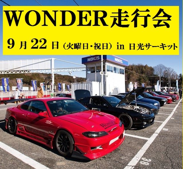 9月 22日 (火・祝日・シルバーウィーク) 日光サーキット WONDER走行会を開催いたします!!! エンジョイ派の走行会クラス 腕試しのドリコンクラス 初級、中級、上級,各クラス分け設定あり ドリコン入賞者には,各クラスにトロフィーと賞金が贈呈されます!!! (賞金の金額は各クラスエントリー台数によって変動します) ★参加費★ 走行クラス ¥13.000 ドリコンクラス ¥14.000 保険料含む) ※但し女性、22歳以下の方は上記金額から¥2.000引き! ★走行本数★ 走行