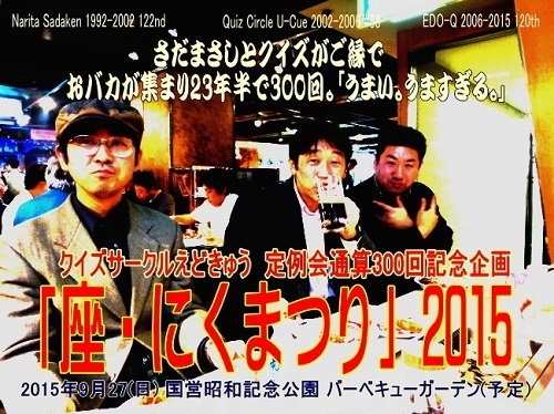 ※注 むろかつさんの了承をいただきましてTRAX(テトラ)がトピを立てました。 基本的には、えどきゅう公式ブログのこちらの記事を転載・整理したものです。 http://edoq.hatenablog.jp/entry/2015/07/27/172923 今年秋に、クイズサークルえどきゅうは、前身団体である「成田さだまさし研究会」「クイズサークルうきゅー」から通算して23年半で300回目の定例会を迎えることになりました。 それを記念してのBBQ企画でもやろうかな、という企画を立てまして、実行に移すことになりました。 日時:2015/09/27 (※注 第「4」日曜日です) 場所