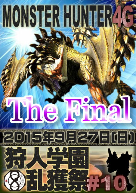 ついに狩学乱獲祭も第10回にしてMH4Gとしては最終回!となります。 この9/27という狩学が生まれてちょうど35ヶ月のこの日曜日、 最後まで狩学乱獲祭らしく!超効率でクエをこなしながらも笑いの絶えない1日にしましょう。 今まで何度もご参加いただいた方にとって最後の「お疲れ様会」になるような 笑いあり、涙あり(?)の楽しいイベントにしたいですね! もちろん初参加の方も大歓迎!こちら↓をよく読んでいただいて参加表明お願いします 【乱獲祭について】 この日は月1回の乱獲のみを楽しむ為のイベントです。 いわゆ