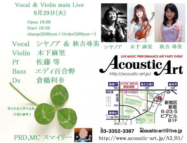 Vocal & Violin main Live 9月29日(火) Open 19:00 Start 19:30 charge2500yen+Order(500yen〜) Vocal シヤノア & 秋吉 尋美 Violin 木下 麻里 Pf 佐藤 等 Bass エディ百合野 Ds 倉橋 利幸 セッションタイムもございます♪ ご予約承ります。 ♪♪スマイリー企画 Vol.2